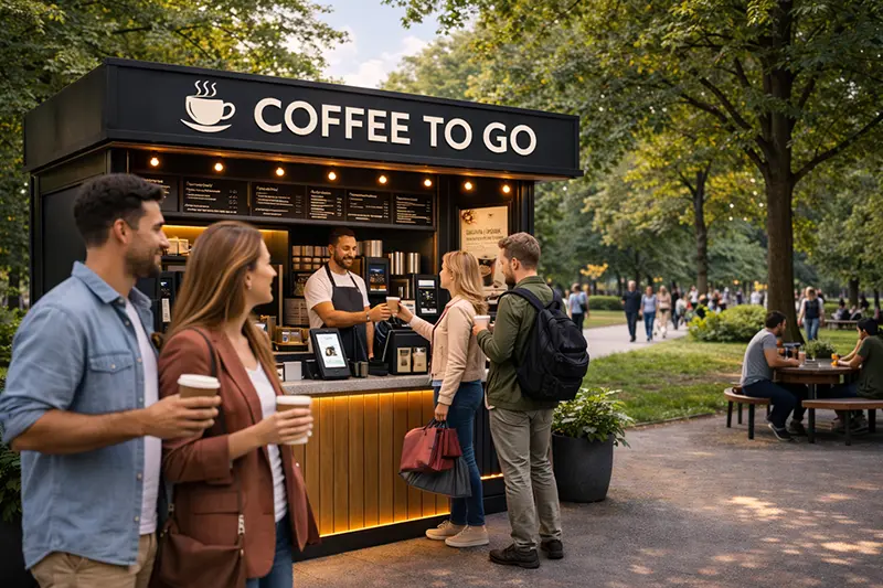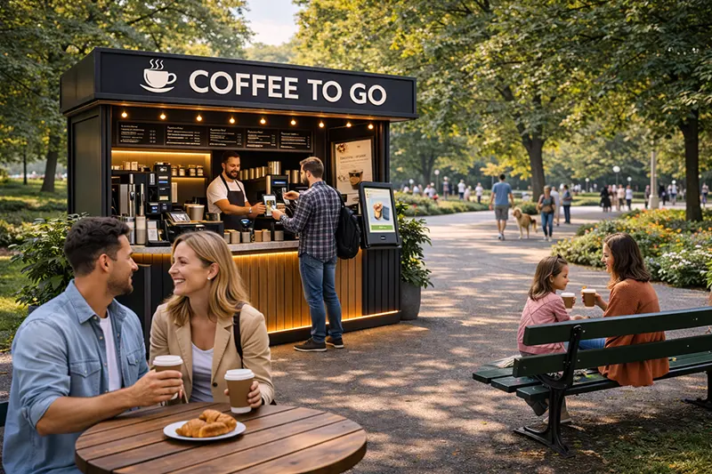 Модульные кофейни самообслуживания — это компактные, удобные и эффективные решения для быстрого питания и кофе. Эти кофейни предназначены для установки в местах с высокой проходимостью, таких как торговые центры, вокзалы, парки и улицы. Кофейни имеют все необходимое оборудование для работы, включая кофемашины, кассовые аппараты и систему самообслуживания для удобства клиентов. Мы создаем кофейни, которые могут быть легко адаптированы под ваш бренд, с возможностью выбора цвета, материала отделки и технического оснащения.